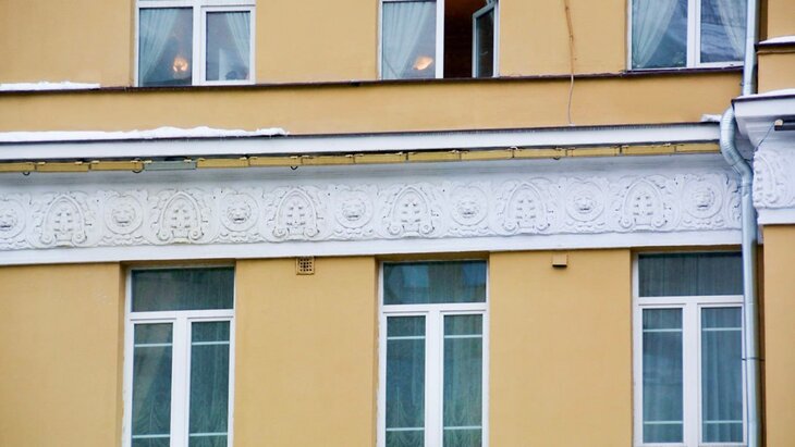 1 из 2Здание в Большом Кисловском переулке украшает лепнина в виде козьих голов. Этот дом возведен симметрично с выделенными по фасаду двумя полукруглыми эркерами. Специалисты восстановили лепнину, привели в порядок карниз дома, обновили краску на фасадах и провели другие необходимые работы. Финальными штрихами стали обновление цоколя, замена отливов и водосточных труб дома.