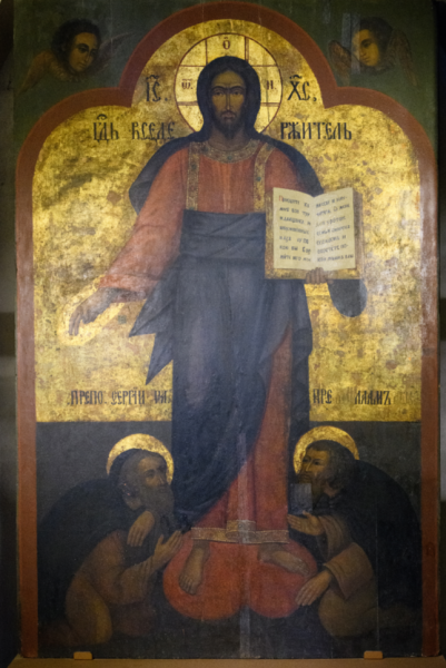 Исторический музей начал первый этап реставрации уникальной иконы XIX века «Спас Смоленский с припадающими преподобными Сергием Радонежским и Варлаамом Хутынским», находящейся в храме Василия Блаженного (Покровском соборе).